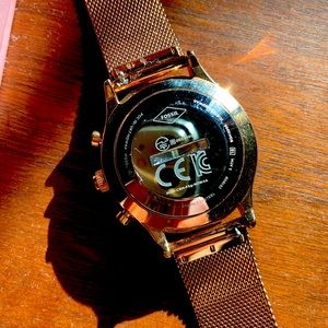 I’ve probably only worn this fabulous watch 10 times, I would save it instead of wear it. 😂 But this is so cool, my hubby gave it to me on an anniversary and it’s STUNNING. Listed as “Rose gold tone-stainless steel” online. Easy clasp band.
