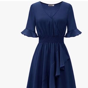 Highlights of The Smocked Waist Dress: Midi Length, Ruffle Short Sleeve, Hi-lo Hem, V Neck, Smocked Waist. The v neck design shows your charming neckline, ruffle sleeves add loveliness and better hide arm. The elastic smocked waist dress lengthens the body proportion and hides belly fat pretty well. Pretty high low hemline make Legs more lender.