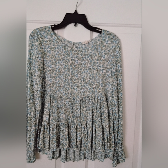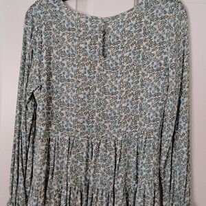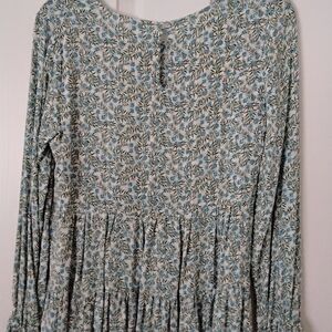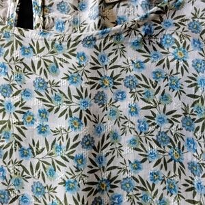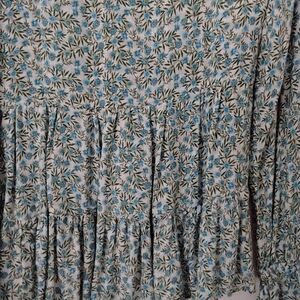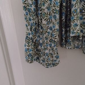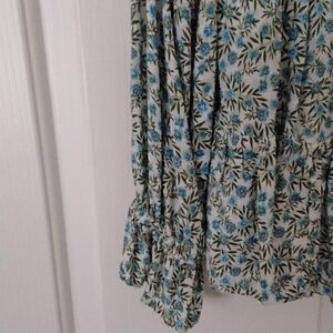 Ladies Hi Low Ruffled Blouse, Floral Pattern in Blue,Green and White