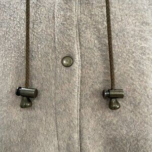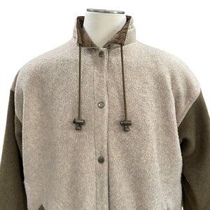 Stay warm and stylish with this jacket, featuring a cozy sherpa fleece side and a smooth tan nylon shell. Designed with an oversized fit, snap button closure, and drawstring collar for added versatility and comfort. The tan and olive color-blocked design offers a classic, outdoorsy aesthetic perfect for layering in colder weather. Whether you're hiking, camping, or just enjoying a casual day out, this jacket is a must-have for your wardrobe.