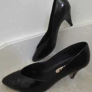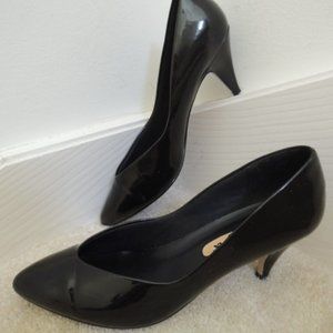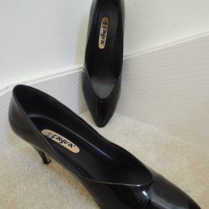Black patent leather look pumps/high-heeled shoes from "FAYVA Shoes", size 8-1/2 M, 3" tall heels, all man-made materials. Worn once for an occasion, small scuff at bottom of heels, no cracks or scratches in the patent leather. "Anti-skid masking" was applied to the soles to keep one from slipping or falling down and can be removed and/or replaced with new anti-skid material available at shoe repair shops. Comes with extra heel top pieces plus 2 securing pins. From a smoke-free/pet free home.