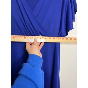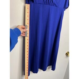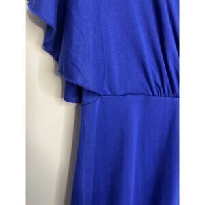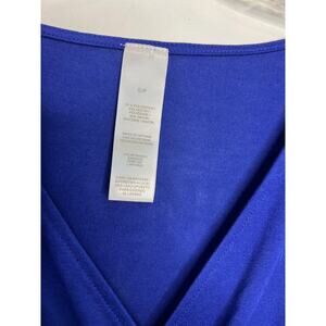 This ladies short sleeve wrap cross over V-neck dress is a stylish and versatile option for a casual occasion. Made from comfortable polyester jersey fabric, this size small dress features a flattering A-line silhouette with a midi length and a swinging, flared hem. The solid blue color adds a pop of color to your wardrobe, while the pullover closure makes it easy to wear. Machine washable and perfect for everyday wear, this dress combines style and convenience effortlessly.