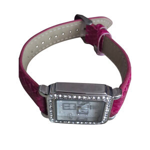 Ladies Silver toned watch Rhinestones around face Art Deco BOHO Leather band