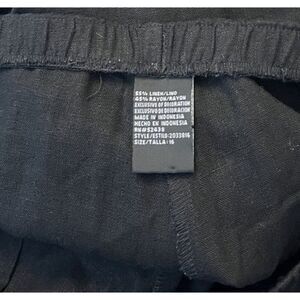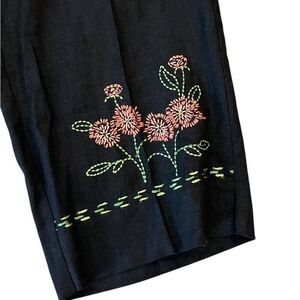 Ladies Size 16 Black Linen Pants Floral Embroidery Pull On Elastic Waist