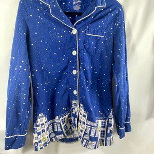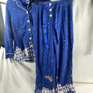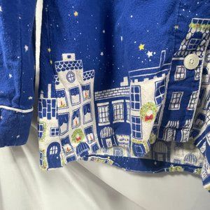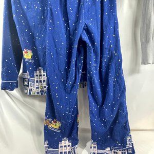 These PJs are a set button down top and pull on pants. They feature a Blue night sky background with Santa sleigh and reindeer flying over the city. These are gently used and very comfy. Material 100% Cotton