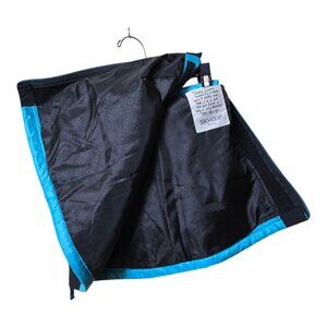Ladies size Medium. Approx. 16 inches across the waist, 14 inches long. Skirt is blue and black. This item is in good, gently used condition.