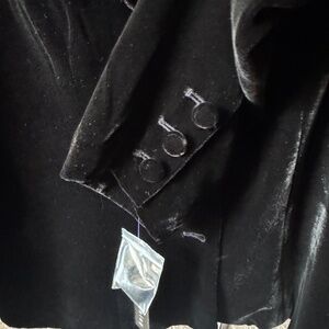 NWT Spenser Evening velvet jacket with ruffle collar, button front. Rayon/silk and Size 10. Measures approximately 23” L from shoulder to hem and 19” pit to pit.