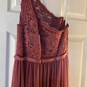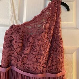 Ladies Sz 10 dress from David's Bridal. Beautiful dress with lace top, fully lined. This is a Sz 10 but was altered to a Sz 8. Dress has a split up the front. One shoulder dress worn once in a wedding. Smoke free home. Great preowned condition.