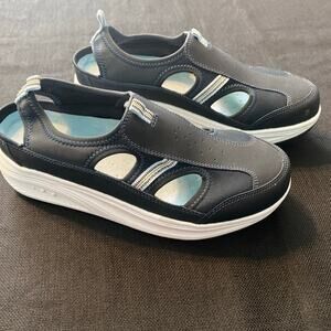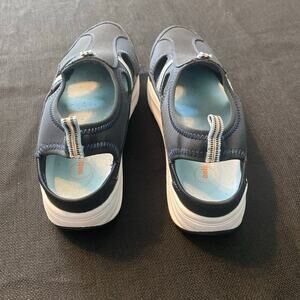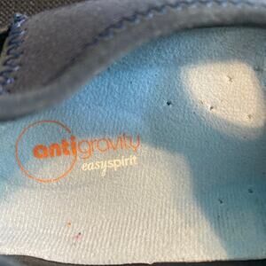 Ladies Sz 10 easy spirit anti gravity. Blue with white soles and the inside is light blue. The heel is made of elastic. I’ve worn once, it’s just not my go to shoe. These are very lightweight and comfortable.