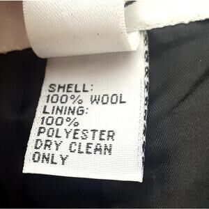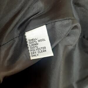 Nice Business suit. Wear to work, a cocktail party, the opera/a a play or to a funeral. Trousers are lined. They have belt loops and 2 small front pockets. Waist closure is 2 buttons (one internal and one external) and zipper. Made of 100% wool. Jacket is tailored with 8 gold buttons down to the waist, 4 gold buttons also on the cuffs, mandarin collar, lined and 2 front pockets. This suit is always in style, especially for the workplace. It is an investment piece which will be a workhorse for you. Jacket is 100% wool also.