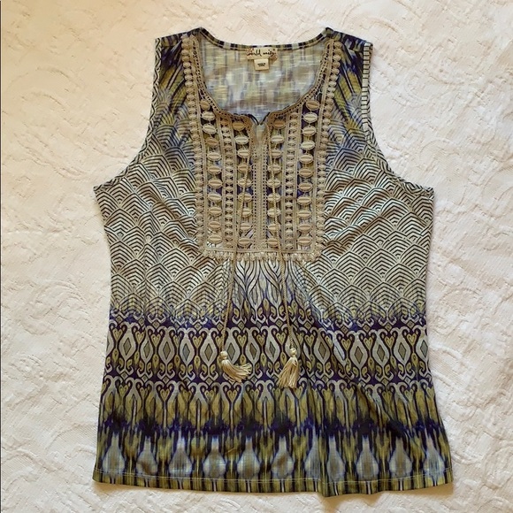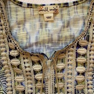 By world unity size m beautifully designed fabric. Just the right amount of detail on chest with tassels Bin 1