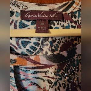 Short sleeve ladies top. Multi colored with black, brown, orange and turquoise. Has silver beads to give a little bling.