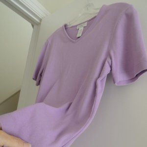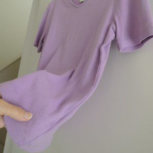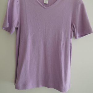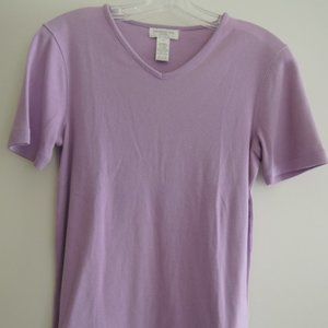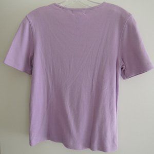 Classic fit, this 100% cotton, v-shaped crew neck top is perfect for tucking into high-waist flares or layering over workday staples like slacks and pencil skirts. It's also the perfect underpinning to any jacket or cardigan, making it an office style essential as well as an everyday favorite for casual and all occasions.This women's/misses/ladies short-sleeved top is 100% cotton, a lilac purple color, with a slight stretch to it for size adjusting. Sewn-in tags state "Jones New York Sport, 100% cotton, Made in Northern Mariana Islands (USA)". Worn once for an occasion, then properly cleaned and stored flat, not on hanger, in a cool, dry place. Originally purchased as a gift at a high-end dept. store on Michigan Ave. in Chicago for $49.00 (plus tax which you don't pay to me), making this top a real bargain. Overall excellent gently used condition, may show some shelf wear/slight pilling as it was jostled around from time to time among other stored tops. Comes from a smoke free/pet free home.