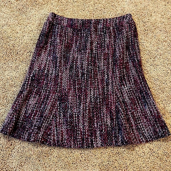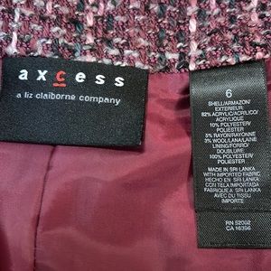 Axcess tweed skirt size 6. Skirt flares at hem and is lined. Has side zipper and hook. Colors of tweed are magenta, pink, grey and black.