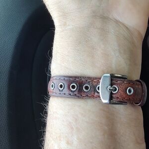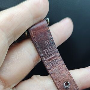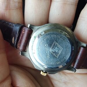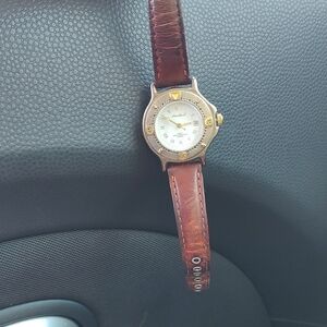 This vintage Eddie Bauer ladies watch showcases a classic blend of silver and gold tones around a white luminous face and date box with a distressed brown leather band. Crafted with precision, it embodies the brand's commitment to quality and style. Needs a new battery.