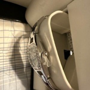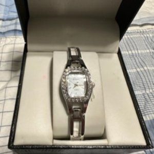 New, no tags, never been worn-still attached to original box. It was purchased to gift but was never gifted. Silver tone chain band, with mother of pearl dial, surrounded by crystals. Beautiful!! Dial measures 22 mm x 24 mm. Unable to measure bracelet, as it is attached to box.