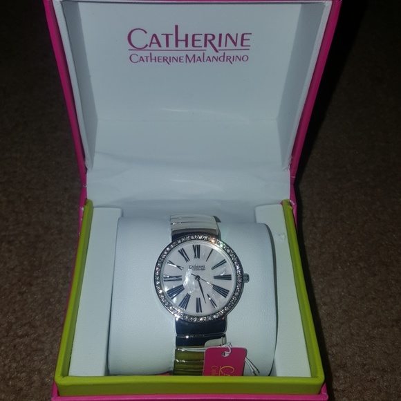 Womens Catherine by Catherine Malandrino watch features a silver and crystal case, pink dial, silver numbers, and silver metal strap. Japan movement.