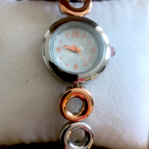 Rose gold and silver toned bracelet wrist watch. Never worn and still attached to box. Great for work or play.