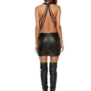 Ladies Wet Black Faux Leather Backless Mini Club Dress
