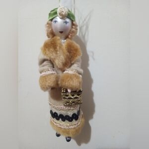 The Ladies with Elegance Glass Ornament features a beautifully designed woman in a fur-trimmed coat, standing at 8 inches tall. This multicolored ornament is hand-blown glass with an elegant retro design, perfect for all occasions. It is part of an original collection of ornaments, showcasing a fashion theme and intricate embellishments. The hanging ornament is a unique piece for any collector's holiday decor.