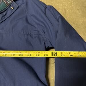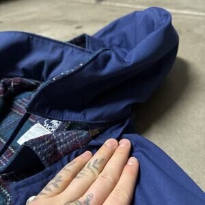 This is a classic Woolrich Field Jacket for women in size Large, featuring a full zipper and snap closure with a hood for added warmth. The outer shell material is polyester with a cozy flannel lining, suitable for casual outdoor wear. The jacket has a mid-length design with long sleeves, accented with buttons and zippers. It showcases a solid blue color and incorporates wool insulation, making it ideal for chilly weather. The jacket's USA, outdoor, and classic 90s theme adds a touch of nostalgic style to the wardrobe.