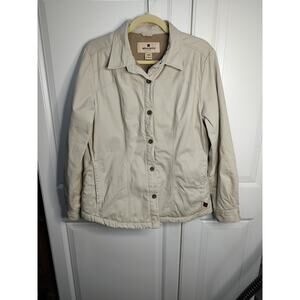 The Ladies Woolrich Jacket in British Tan is a stylish and versatile addition to any woman's wardrobe. Made with a durable cotton outer shell and lined with cozy flannel, this jacket is perfect for the fall and spring seasons. The classy barn jacket style adds a touch of sophistication to any outfit, while the long sleeves and regular fit ensure both comfort and style. Easy to care for with its machine washable design, this beige jacket is a must-have for the modern woman looking for a timeless and practical outerwear piece.