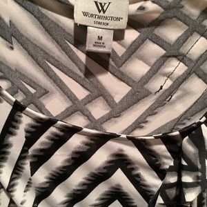 Black and white geometric pattern with left should ruffle down the front and across the shoulder top to the back. Really sharp looking and a very slimming look to the back.