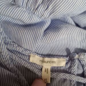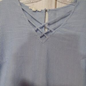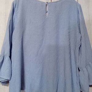 Ladies XL Blue Striped Blouse Criss Cross V Neck Bell Sleeve Top