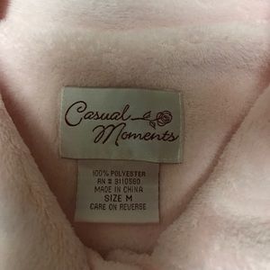 The softest fabric (100% polyester), very plush and the sweetest color of baby pink. Peter Pan collar. 2 button closure. 2 front patch pockets. Bought as a gift for my precious MIL, but she was never able to use it.