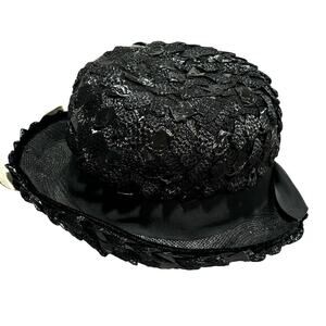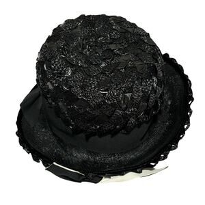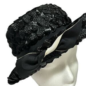 Vintage Robby-Ann ladies balck straw fedora style hat. This example is woven in a synthetic ribbon straw - clearly tagged - a classic mid century style with a unique white twist on the front bow. Black hatband with upturned brim - union label inside.