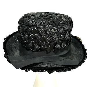 Ladies black straw fedora hat woven white hatband trim bow dressy mid century