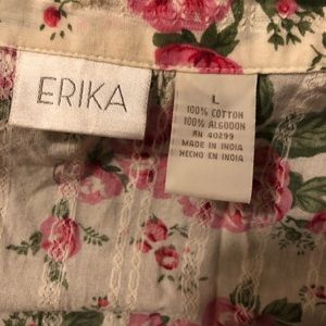Pretty button down shirt, white and covered in roses. Missing top button but easy fix.