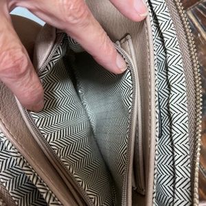 Ladies clutch purse with short and long straps. 3 compartments with, one with card holders. Great shape