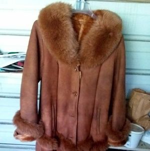 The coat looks like shearling with Fox fur collar and cuffs. It's beautiful!