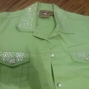 Ladies green Jean jacket, with diamonds around neck, and pockets. Size medium, In perfect condition $15