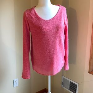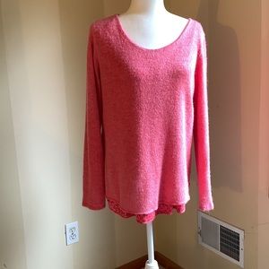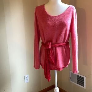 Ladies, coral colored sweater with flowered liner blows around the bottom of this weather matching scarf can be worn around the neck or at the waist line. Great condition.