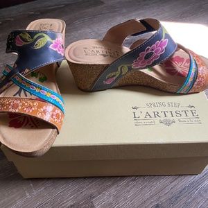 These comfy cork wedge sandles are multi-pattern and multicolor so they go with everything! Patterns contain pink, blue, turquoise, green and orange. Worn once.