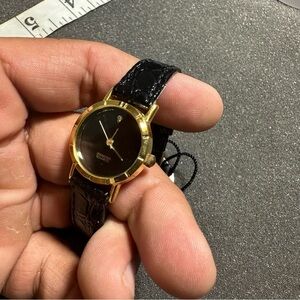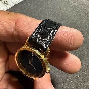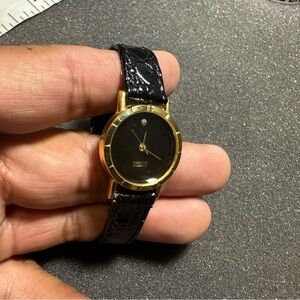 Ladies diamond quartz watch gold tone blak dial black band working with new battery may show signs of wear from storage and such as light scratches on case and crystal see pictures for reference