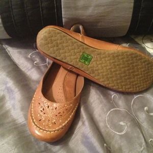 Light leather brown flat ladies shoes with stitching on the front & back of heel area. Rubber sole, leather upper & sock. Will trade