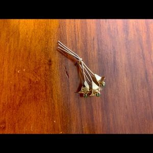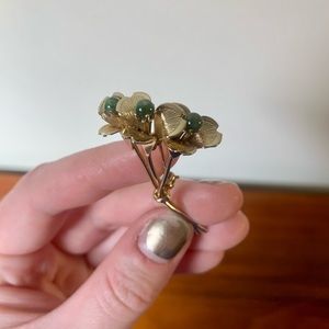 A vintage women’s flower bouquet brooch pin that is gold in color and features 3 green jade stones. Check out my page for more vintage brooches and jewelry!