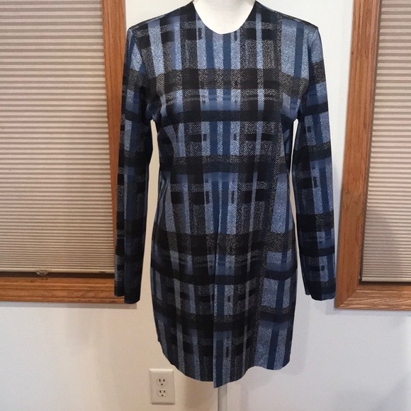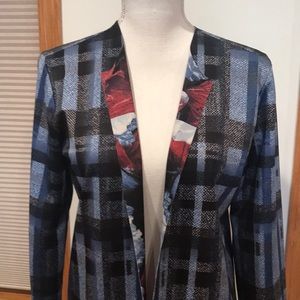 EUC only worn once! Blue plaid poly/spandex jacket. Great with a legging/ bootie and scarf.... approx 29” in length and approx 15 1/2” pit to pit lying flat