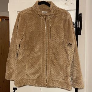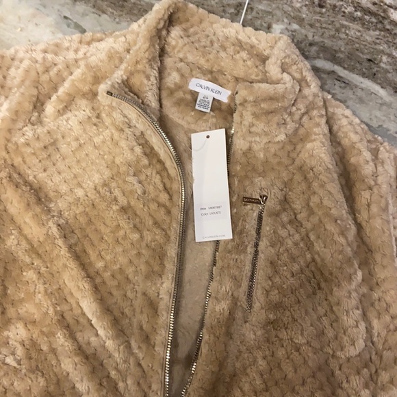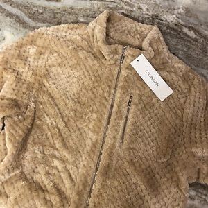 Soft, zippered front jacket, gold tone zipper with gold zipper pocket on front, two side pockets