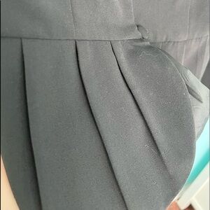 This is a lovely light weight dress jacket. What stands out is the many design details of this jacket: the beautiful bow, the pleats in the front, the buttons etc. The color is beautiful black. The pictures don’t capture the true black this is. It’s not light black or gray.