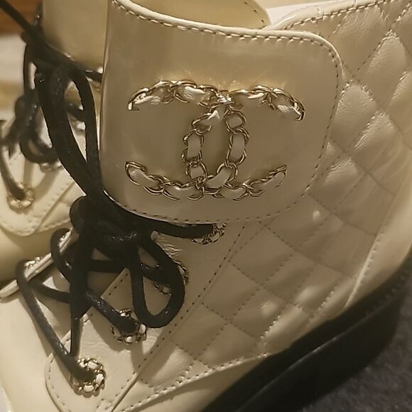 Ladies Ivory&Black Laceup Shiny Calfskin Chanel boots