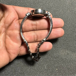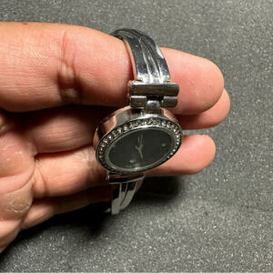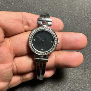 Ladies quartz silver tone diamond accent wrist watch working with new battery black dial shows signs of light wear such as scratches on case band and crystal see pictures for reference
