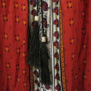 Soft comfortable fabric. Very bright colors, this skirt has red, white, blue skirt with some golden orange and white. Pretty tassels adorn the front. Fabric is rayon made in India. Size large. New with tag. Bottom has a complimentary pattern. Pretty skirt that can be paired with many tops!