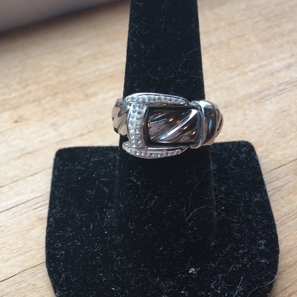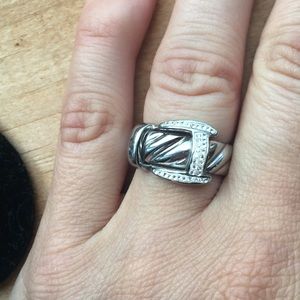 Looks like a silver buckle with small CZ stones. Very playful piece