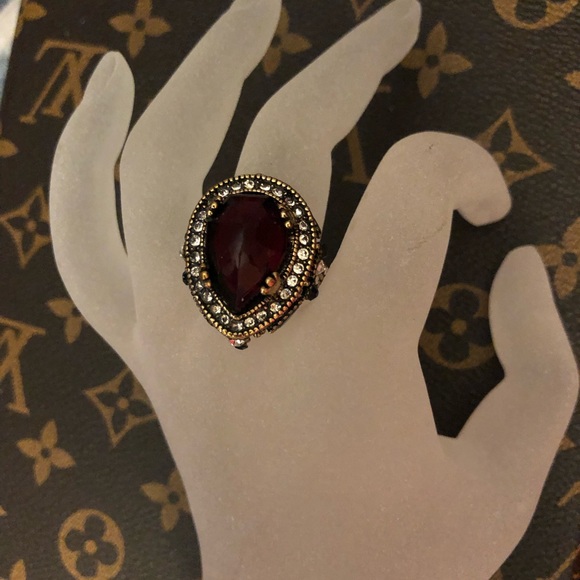 Fun costume ring with a garnet stone in the center and other colored stones around the bottom. Size 8