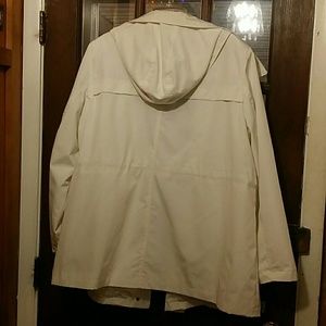 White hooded jacket with adjustable waist. Very good condition. Unlined, very thin jacket.