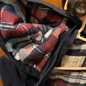 Ladies XL navy spring/fall jacket. Lined with plaid fabric, soft and warm on rainy cool days. Attached hood for wind and rain protection. Large front patch pockets for cell phone, keys and other essentials. In excellent used condition!